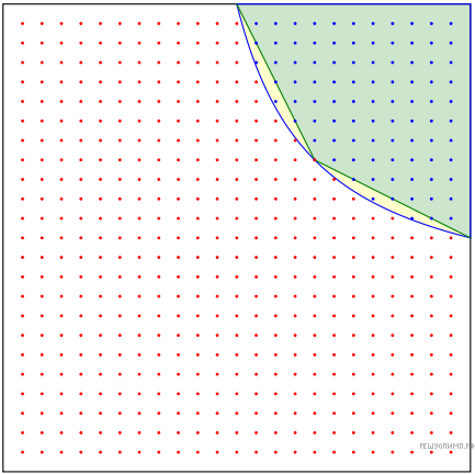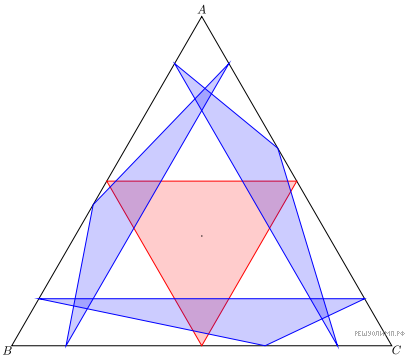 Сторона BC правильного треугольника ABC разделена на 2016 равных частей точками A1, . . . , A2015, стороны AC и AB — точками B1, . . . , B2015 и C1, . . . , C2015. Треугольник AiBjCk называется красным, если содержит центр ABC, и синим иначе. Каких треугольников больше, красных или синих?